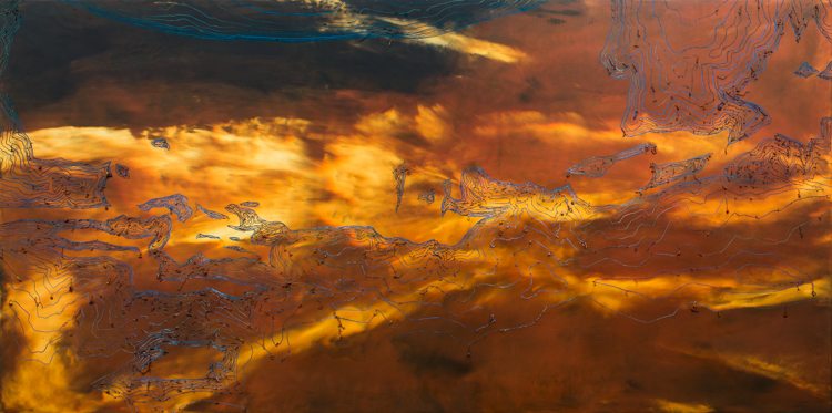 Foreshadow, recall, and the tension of freedom; 24″ x 48″, oil and wax on panel.